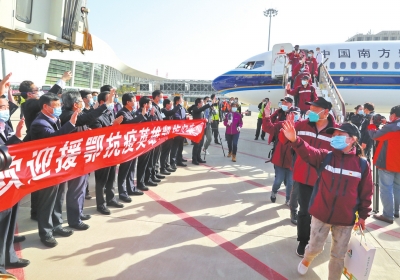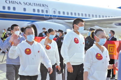 經(jīng)一個多月的艱苦奮戰(zhàn),453名健康勇士圓滿出色地完成了援助工作任務,平平安安、載譽歸來!省衛(wèi)生健康委闞全程主任等領導到機場迎接,并轉達省委書記王國生、省長尹弘的親切慰問。