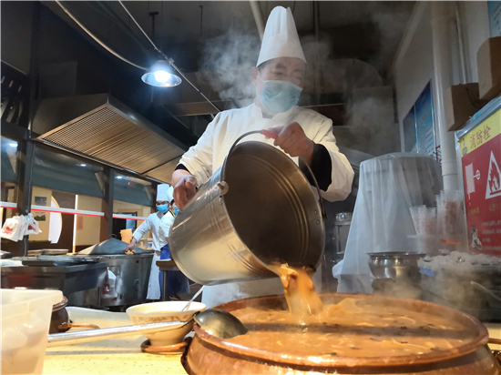 當(dāng)日凌晨3時(shí)30分,記者趕到這家早餐店,這里已是燈火通明,廚師和員工經(jīng)過(guò)測(cè)溫消毒后開始了一天繁忙的工作。“雖然現(xiàn)在允許堂食了,但我們的防控工作依然沒(méi)有放松,認(rèn)真做好每一位食客的測(cè)溫和登記工作。”該店經(jīng)理王艷告訴記者,他們是昨天接到縣食品藥品監(jiān)督部門允許堂食的通知,隨后,他們對(duì)店面進(jìn)行了全面消殺工作,并將餐桌撤掉一半,保持一米以上間隔距離。