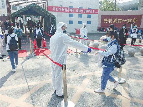 圖一 4月7日,周口一高三年級學(xué)生在入校前測量體溫。當(dāng)天,我市高中三年級學(xué)生正式復(fù)課,廣大學(xué)生按照疫情防控要求,錯峰、錯時有序入校。 記者 張洪濤 攝