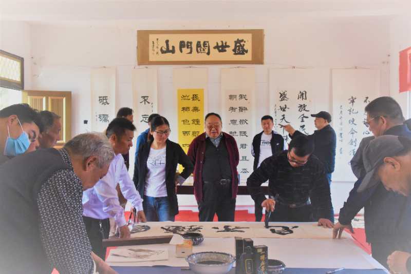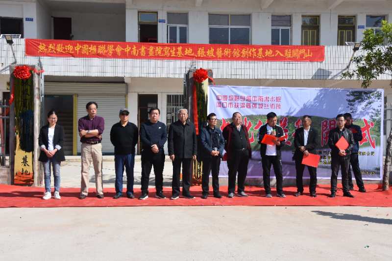 路晉成、張俊鵬、高麗、張紅先現(xiàn)場(chǎng)為中南書(shū)畫(huà)院關(guān)門(mén)山寫(xiě)生基地、張坡藝術(shù)館關(guān)門(mén)山創(chuàng)作基地揭牌。書(shū)畫(huà)家們還現(xiàn)場(chǎng)揮毫潑墨,為村文化中心即興創(chuàng)作了書(shū)畫(huà)作品,并給當(dāng)?shù)鼐栀?zèng)了三十多幅書(shū)畫(huà)名家佳作。