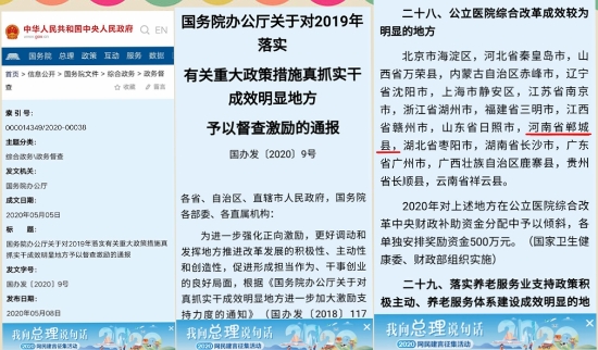 5月8日,中華人民共和國中央人民政府門戶網(wǎng)站發(fā)布《國務(wù)院辦公廳關(guān)于對2019年落實(shí)有關(guān)重大政策措施真抓實(shí)干成效明顯地方予以督查激勵的通報》國辦發(fā)〔2020〕9號文件,對213個地方予以督查激勵,相應(yīng)采取30項(xiàng)獎勵支持措施。其中,鄲城縣榮登“對公立醫(yī)院綜合改革成效較為明顯的地方”名錄,獲獎500萬元。