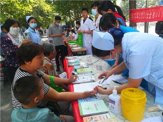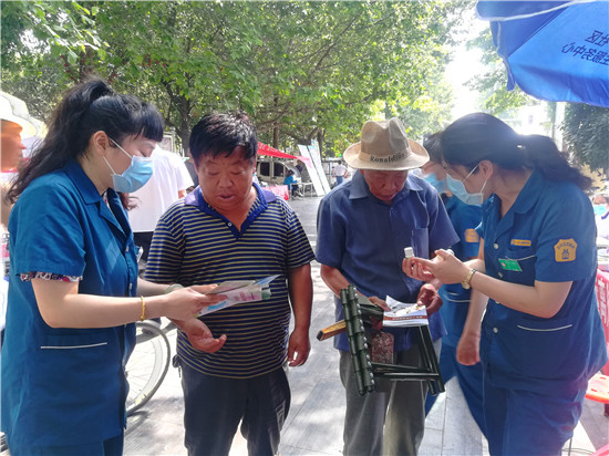 活動現(xiàn)場,參加宣傳活動的各單位工作人員為市民散發(fā)宣傳相關(guān)資料,并為市民進行義診。