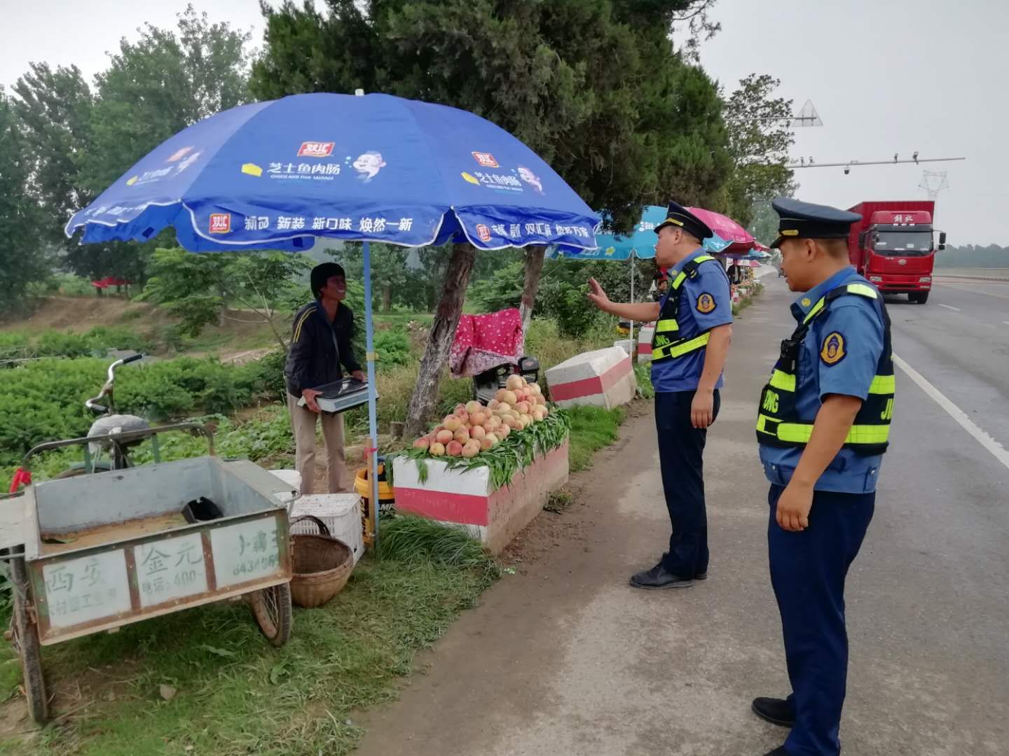隨著瓜果等農(nóng)產(chǎn)品陸續(xù)上市,龍?jiān)绰犯浇芏啻迕裰苯影压瞎逊旁诠愤吷险嫉澜?jīng)營,給道路交通帶來嚴(yán)重的安全隱患。通過勸導(dǎo)、宣傳教育,提高了沿線經(jīng)營戶對(duì)違章占用公路擺攤設(shè)點(diǎn)危害性的認(rèn)識(shí),自覺將攤點(diǎn)撤離公路至安全地帶,確保了沿線公路的安全暢通。