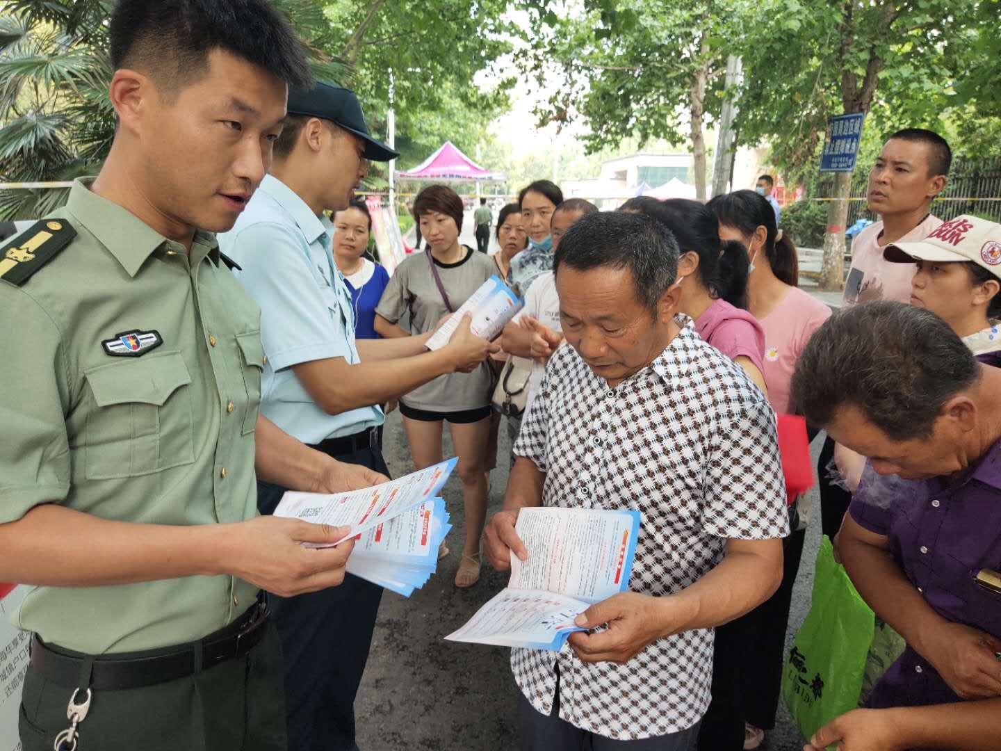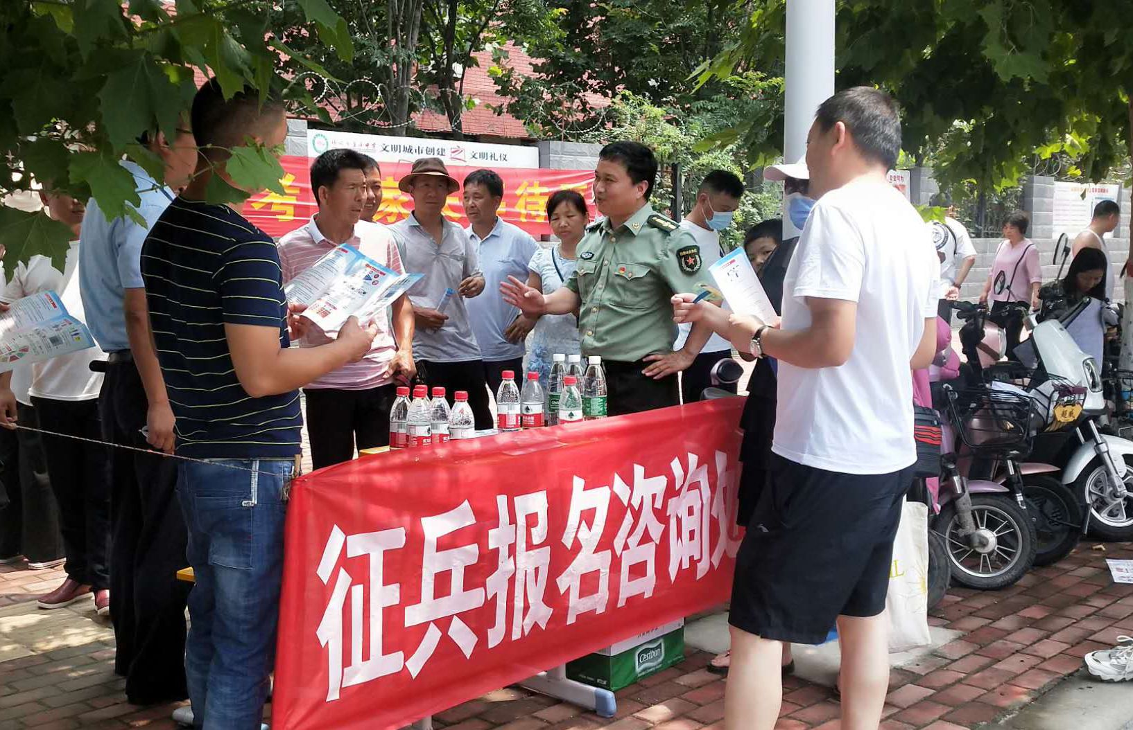 為強(qiáng)化全民依法履行兵役義務(wù)觀念,激發(fā)廣大適齡青年特別是高學(xué)歷青年參軍入伍熱情,7月7日至8日,項(xiàng)城市人武部組織機(jī)關(guān)所有人員和21個(gè)鎮(zhèn)(街道)辦事處武裝部長(zhǎng)等36人,深入各考點(diǎn)設(shè)立征兵政策咨詢(xún)點(diǎn),懸掛宣傳標(biāo)語(yǔ)、擺放宣傳版面,開(kāi)展以助力高考為目的的大學(xué)生征兵宣傳活動(dòng)。為不影響考場(chǎng)秩序避免打擾高考,7月7日全天,參加宣傳的工作人員悄悄走進(jìn)家長(zhǎng)等待區(qū),現(xiàn)場(chǎng)向廣大考生家長(zhǎng)以及過(guò)往群眾發(fā)放《應(yīng)征入伍明白卡》、《大學(xué)生入伍優(yōu)惠政策》等征兵宣傳資料,并接受咨詢(xún)。7月8日下午5點(diǎn)30分后,為期兩天的高考結(jié)束后考生放松的走出考場(chǎng)大門(mén)之際,所有人員同時(shí)守在大門(mén)外,一邊給考生發(fā)放宣傳資料,一邊接受學(xué)生咨詢(xún)和報(bào)名,給他們講解大學(xué)生入伍政策、法規(guī),介紹“應(yīng)征入伍的政治、文化、身體和年齡條件”、“報(bào)名程序”、“就業(yè)安置”等相關(guān)內(nèi)容,鼓勵(lì)高中畢業(yè)生帶著成績(jī)和文化知識(shí)投身軍營(yíng)、報(bào)效祖國(guó)。