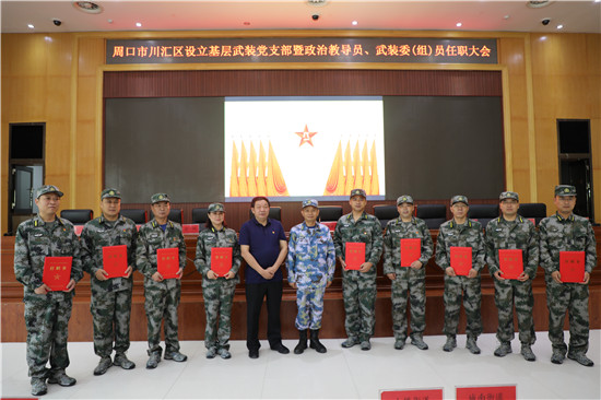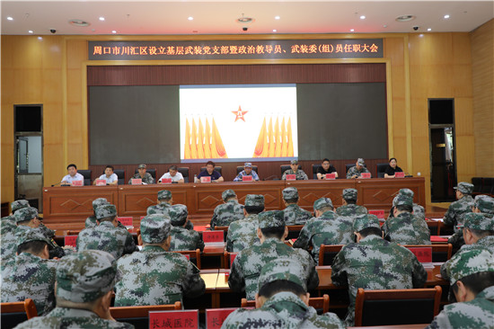 黨管武裝建設國防,軍民攜手共筑長城。為健全武裝工作組織領導體系為推動國防動員和后備力量建設在基層末端落實,7月16日上午,周口市川匯區(qū)召開基層武裝黨支部暨政治教導員、武裝委(組)員任職大會。周口軍分區(qū)司令員湯維政,區(qū)委書記、區(qū)人武部黨委第一書記李宗喜,周口軍分區(qū)政治工作處主任李揚,市委組織部副處級調研員宋陽,區(qū)人武部政委高新傳、部長陳繼芳及城鄉(xiāng)一體化示示范區(qū)、經(jīng)濟開發(fā)區(qū)、港口物流產(chǎn)業(yè)聚集區(qū)等有關負責同志參加了大會。會上設立了18個基層武裝黨支部,任命了15名基層武裝部政治教導員、20名村(社區(qū))武裝委(組)員任職命令,武裝部政治教導員、武裝預建黨支部書記和兼職武裝委(組)員代表先后作了履職承諾發(fā)言,湯維政等為新任命的人員頒發(fā)了任職證書。