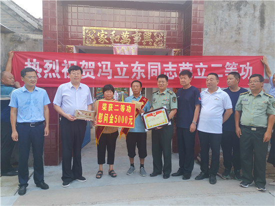8月1日,淮陽區(qū)人武部負責人李保祥與該區(qū)退役軍人事務局局長董天祥等人一起,帶著二等功喜報及慰問金,專程趕往該區(qū)四通鎮(zhèn)葉莊行政村前馮橋村現(xiàn)役軍人馮立東家中。此時,村里鑼鼓隊敲響了,村民走出家門紛紛前來觀看,頓時贏得村民的一片喝彩及點贊聲。許多村民說:“孩子在部隊立功授獎,作為軍屬可真是光榮呀!”(記者孫安平 通訊員 張然 張航碩 攝影報道)