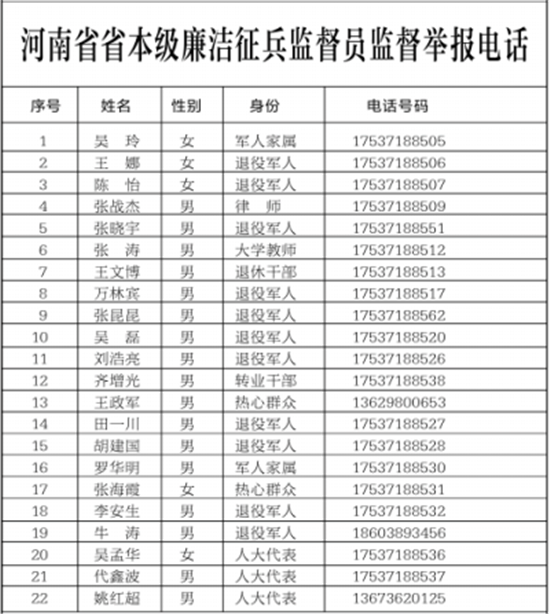 為扎實做好河南省廉潔征兵工作,切實維護廣大應(yīng)征青年合法權(quán)益,確保為國防和軍隊建設(shè)輸送優(yōu)質(zhì)兵員,現(xiàn)將省本級廉潔征兵監(jiān)督員和省市兩級廉潔征兵監(jiān)督舉報方式予以公示,歡迎社會各界對征兵工作予以監(jiān)督。征兵工作政策法規(guī)請關(guān)注“河南征兵”微信公眾號。