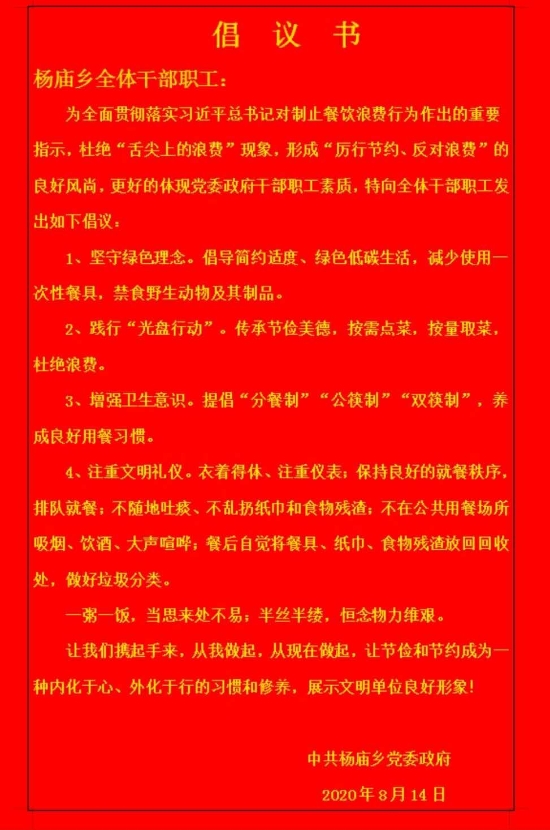 據(jù)楊廟鄉(xiāng)黨委書(shū)記聶運(yùn)亨介紹,該鄉(xiāng)積極響應(yīng)總書(shū)記號(hào)召,向全鄉(xiāng)干部發(fā)出了堅(jiān)守綠色理念、踐行光盤(pán)行動(dòng)、增強(qiáng)衛(wèi)生意識(shí)、注重文明禮儀等四個(gè)方面的倡議,讓全鄉(xiāng)干部從我做起,從現(xiàn)在做起,使勤儉節(jié)約成為習(xí)慣和修養(yǎng)。
