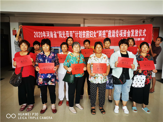 據(jù)悉,此次發(fā)放的公益金來自于河南省陽(yáng)光母親貧困婦女兩癌救助金。其救助對(duì)象是經(jīng)過有檢查資質(zhì)的醫(yī)療機(jī)構(gòu)確診、患有宮頸癌ⅡB以上或浸潤(rùn)型乳腺癌的農(nóng)村貧困婦女,救助標(biāo)準(zhǔn)為每人一次性救助1萬元。