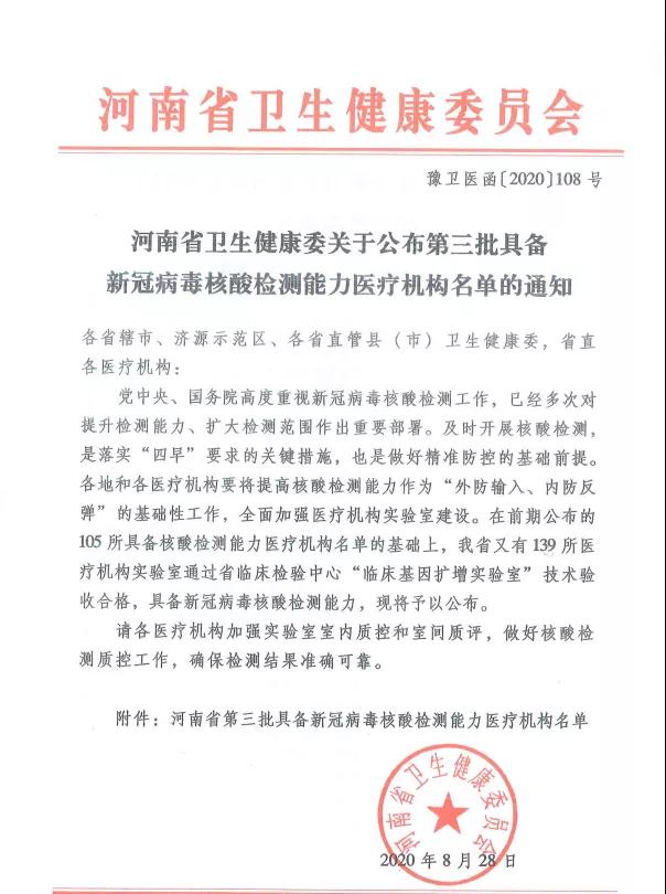 近日,鄲城縣婦幼保健院PCR核酸檢測實驗室通過了河南省臨床檢驗中心的室間質(zhì)量評價和實驗室二級生物安全備案,已具備新冠病毒核酸檢測能力,可承擔(dān)新冠病毒核酸檢測工作。目前,各高校正在陸續(xù)開學(xué),但新冠疫情仍未完全控制,按照疫情防控要求,報到學(xué)生需進(jìn)行一次核酸檢測,持報告單入學(xué)報到。鄲城縣婦幼保健院作為河南省衛(wèi)生健康委員會批準(zhǔn)的新冠核酸檢測機(jī)構(gòu),積極承擔(dān)社會責(zé)任,按照“應(yīng)檢盡檢,愿檢盡檢”的原則,已經(jīng)于2020年9月1日起正式開展新冠病毒核酸檢測工作,希望廣大學(xué)子及有檢測需要的人員,本著對自己負(fù)責(zé)、對家庭負(fù)責(zé)、對社會負(fù)責(zé)的原則,積極檢測,為疫情防控工作貢獻(xiàn)力量。
