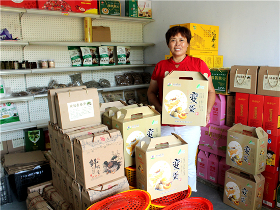 幾年前,孔粉蓮曾干過建材生意,賣過油漆、涂料等,但最讓她得心應(yīng)手的還是經(jīng)營當(dāng)?shù)氐霓r(nóng)特產(chǎn)品。她在村里開了一家小門店,代銷當(dāng)?shù)氐暮睖稀⑹ッ妗⑹秤镁⒓t薯粉條等,顧客贏門,生意很是紅火。