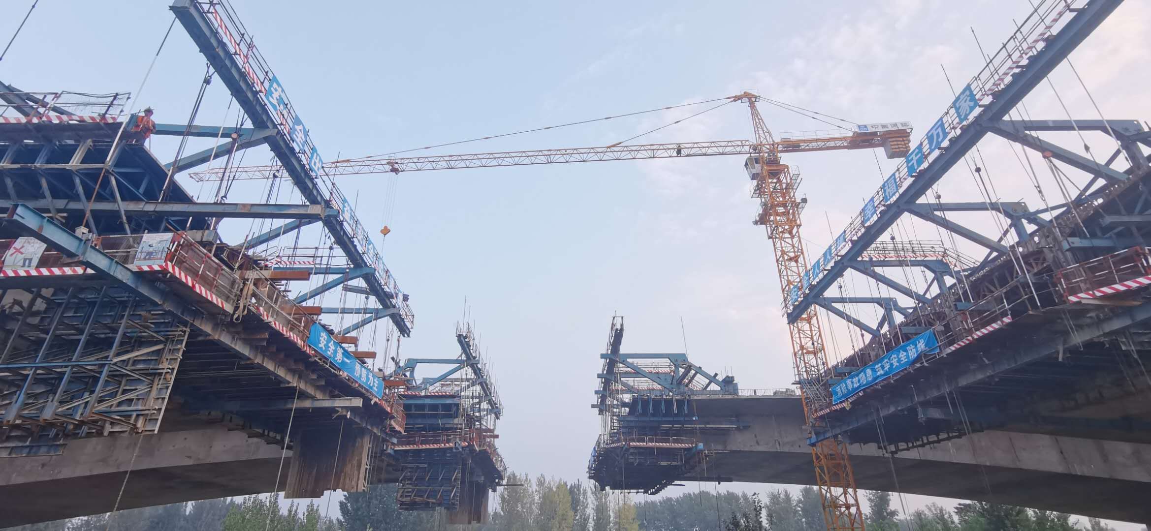 該橋東西兩側(cè)引橋采用40米預(yù)應(yīng)力箱梁,全橋40米預(yù)制箱梁252片,東側(cè)引橋梁板架設(shè)已全部完成正在進(jìn)行橋面系施工,西側(cè)引橋已架設(shè)半幅。主橋采用預(yù)應(yīng)力變截面連續(xù)現(xiàn)澆梁,懸澆段共16個節(jié)段,采用四套菱形掛籃;左幅已施工至15號節(jié)段,即將開始合龍段施工;右幅已施工至12號節(jié)段。