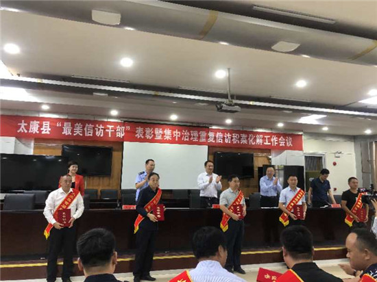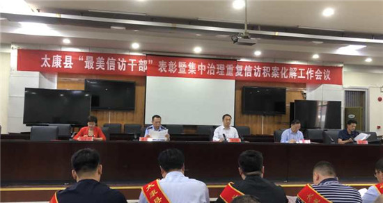 會上,縣公安局局長李根闖同志宣讀了《太康縣首屆“最美信訪干部”表彰決定》;參會領導為首屆“最美信訪干部”代表頒發(fā)了榮譽證書;遜母口鎮(zhèn)王登領、朱口鎮(zhèn)李道倉、大許寨鎮(zhèn)劉二振等三名同志代表全縣首屆“最美信訪干部”做了典型發(fā)言;縣委政法委常務副書記、信訪局黨組書記、局長趙春麗同志傳達了中央、省、市有關會議和批示精神,并通報全縣赴京越級訪情況。