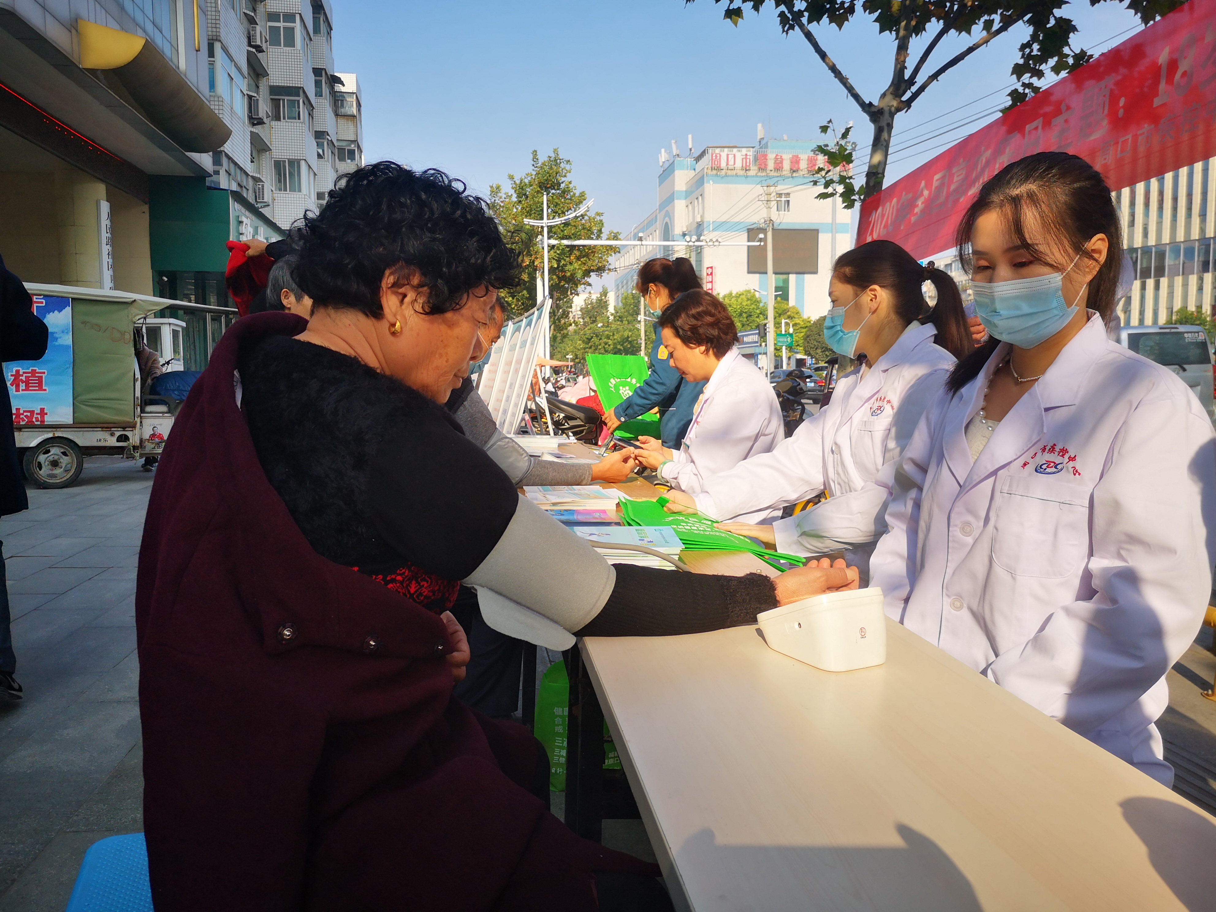 10月8日是第23個全國高血壓日,周口巿疾控中心積極開展防治高血壓科普知識宣傳活動,在人民路東段設立咨詢義診臺,為前來咨詢的群眾測量血壓、血糖,向群眾宣傳“合理膳食,適量運動”“健康心率、健康血壓”等知識。圖為市疾控中心工作人員為過往群眾測量血壓。