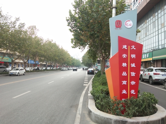 10月11日,記者在周口中心城區(qū)建安路上看到,一個(gè)造型精美,寫(xiě)有“ 文明誠(chéng)信示范街”的指示牌亮相街道邊,為"創(chuàng)文"營(yíng)造了濃濃的宣傳芬圍。記者張洪濤攝