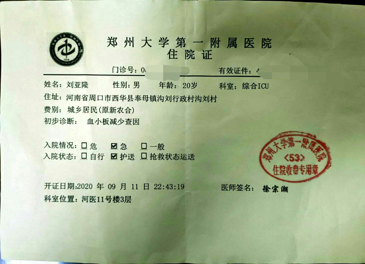 “俺家亞隆今年才20歲,在鄲城一高復(fù)讀一年考了653分,考上‘雙一流’。本來開開心心的,到9月份要開學(xué)了發(fā)現(xiàn)他身上有出血點,牙齦還紅腫,就帶他去漯河檢查。開始說是肝上的毛病,查肝的時候發(fā)現(xiàn)血小板特別低,趕緊轉(zhuǎn)到鄭州,9月15號確診為白血病。還有四天就要上大學(xué)了,現(xiàn)在只能申請推遲一年入學(xué)?!皝喡寢尭嬖V記者。