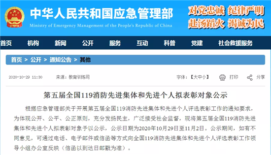 此次評(píng)選表彰工作堅(jiān)持公開(kāi)、公平、公正的原則,按照自下而上、逐級(jí)推薦、民主擇優(yōu)的方式進(jìn)行,11月2日公示結(jié)束。據(jù)悉,這是首次將新組建的國(guó)家綜合性消防救援隊(duì)伍及其指戰(zhàn)員納入該獎(jiǎng)項(xiàng)評(píng)選表彰范圍。