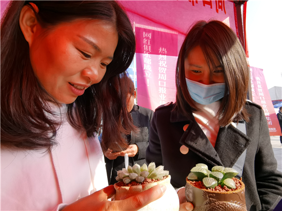 11月6日上午,周口市電商扶貧特色產(chǎn)品展銷會暨第一屆讀者節(jié)系列文化活動剛開始,鄲城多肉盆栽、扶溝縣農(nóng)特產(chǎn)、沈丘縣顧家花饃等周口特產(chǎn)展位前人頭攢動。此次活動聚集了周口特色優(yōu)質(zhì)農(nóng)產(chǎn)品,吸引不少市民。