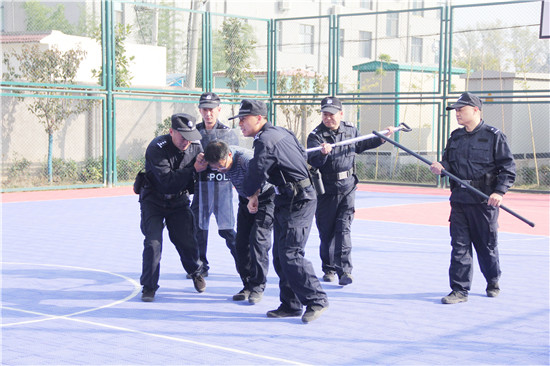 在法警大隊訓練場,考核組一行觀看了擒敵拳和警械具使用、處置突發(fā)事件等實戰(zhàn)應用。在處突演練過程中,5人組成的處突小組模擬各種突發(fā)情況進行實戰(zhàn)演練,法警們反應迅速,執(zhí)法規(guī)范,短短數秒內就將"暴徒"制服。