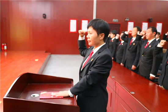 宣誓儀式開始,全體起立,奏唱《中華人民共和國國歌》。隨后,領(lǐng)誓人張冬梅左手撫按《中華人民共和國憲法》,右手舉拳,誦讀誓詞。其他宣誓人列隊肅立,舉起右拳,莊嚴(yán)跟誦。