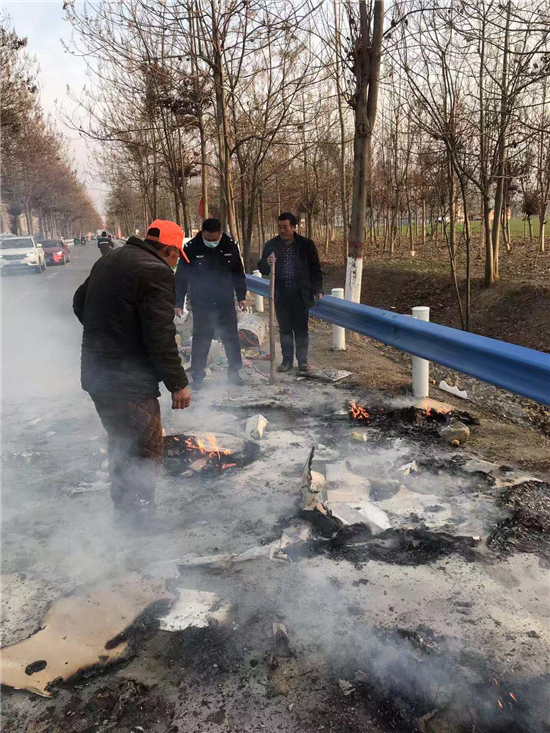當日下午4點左右,太康縣交警大隊二中隊指導員南應開及輔警郭旗全、魯?shù)?、尹晨豪正在趙堂村附近巡邏時,猛然看到前方一輛電動三輪車上有煙氣冒出,巡邏民警加速趕到。原來是一名老漢的一輛拉著廢舊紙箱的電動三輪車著了火,一車廢紙和塑料瓶散落一地正在燃燒,火越燒越旺,只見老漢正在手忙腳亂地滅火。這輛三輪車上拉的全是廢塑料、硬紙殼等易燃物,而且當時正刮著風,如果不及時滅火任由火勢蔓延,后果將不堪設(shè)想。看到此情況后,南應開迅速從警車上拿出滅火器秒變“消防員”,對著起火的物品進行滅火操作,同時安排輔警對過往行人和車輛進行疏導。由于發(fā)現(xiàn)和撲救及時,在民警的緊急救援下,火源很快被眾人合力撲滅。對太康交警面對火情臨危不亂、果斷處置、幫助群眾的行為,老漢車主和過往群眾紛紛點贊。②6