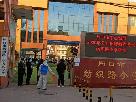 1月10日,周口市中心城區(qū)2020年公開招聘教師考試,考試時間是一天。當天下午,記者在周口市中心城區(qū)2020年公開招聘教師考試紡織路小學考點看到,工作人員在做好考務(wù)工作的同時還做好疫情防控工作。圖為工作人員做防疫消殺。
