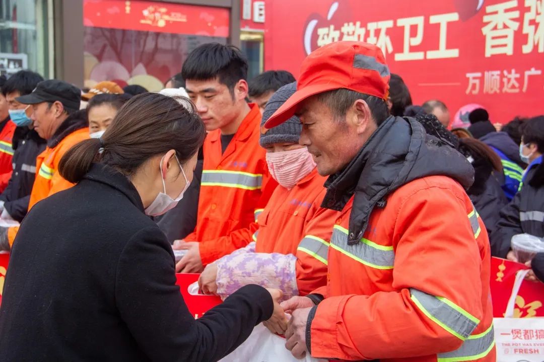 據(jù)了解,萬(wàn)順達(dá)廣場(chǎng)為了本次活動(dòng),精心為環(huán)衛(wèi)工人、公安民警準(zhǔn)備了八寶粥、披薩、油條等營(yíng)養(yǎng)早餐,還有口罩等防疫用品,毛巾、春聯(lián)等生活用品。