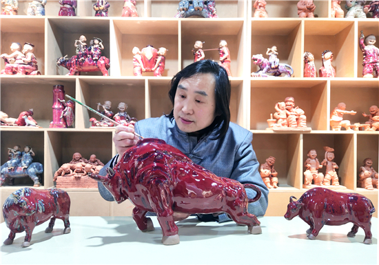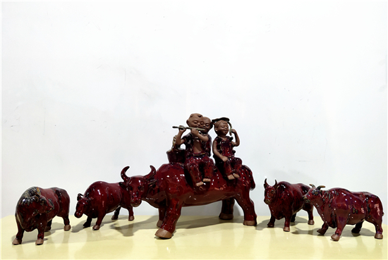 春節(jié)前夕,鄲城泥塑大師張振福歷時(shí)多日制作一組鈞瓷泥塑群雕《瑞牛賀新春》。該組作品分為三頭長約90厘米的大牛和若干頭小牛,均為鈞瓷泥塑,采用豫東黃泥和粗獷手法制作,上釉時(shí)入窯一色,歷經(jīng)1200多攝氏度高溫?zé)坪蟪龈G萬變,十分精彩。拓荒牛精神,展現(xiàn)中國人自立自強(qiáng)的志氣;孺子牛精神,體現(xiàn)在創(chuàng)造美好生活的時(shí)代課題中;老黃牛精神,貴在“心有大我、至誠報(bào)國”的奉獻(xiàn)品格。