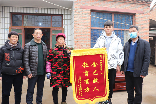 得知張廣坤所在學(xué)校的領(lǐng)導(dǎo)和老師要來村子,被救4歲男孩張子豪的奶奶帶著事先制作的錦旗來到張廣坤家說,原本打算把錦旗送到學(xué)校,感謝陳州高中培養(yǎng)出廣坤這樣的好學(xué)生,是廣坤救了他們?nèi)?。她說,事發(fā)當(dāng)天下午5時(shí),她在家做晚飯,一不留神,4歲的孫子獨(dú)自抱住球出門跑到村坑塘邊的空地上玩耍去了。玩耍中,孩子不慎將球踢進(jìn)了水塘。“4歲的孩子能懂啥,光想著撈他的皮球,水至脖頸,害怕了哭喊起來。當(dāng)日,附近沒有人,孩子身上又穿著襖,要不是被廣坤及時(shí)發(fā)現(xiàn),俺家的日子以后真沒法過?!敝v到這,男孩的奶奶直掉眼淚。