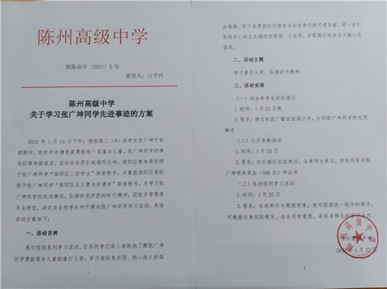 據(jù)陳州高中校長白子興介紹,該校已經(jīng)向全校師生發(fā)起學(xué)習(xí)張廣坤先進(jìn)事跡的倡議,以助人為樂為榮,熱心主動(dòng)幫助他人。學(xué)校還將通過組織專題德育課、開展演講征文活動(dòng)等,深入持久開展學(xué)習(xí)榜樣活動(dòng)。
