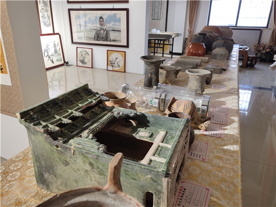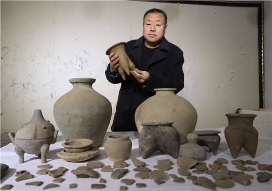 三足燉肉的陶鬲、圓形擦粉的粉盒、前方后圓的灶臺(tái)、帶孔過濾的茶罐、廣口大肚的糧罐、象形浮雕的方磚、雙耳大肚的水壺……1月31日,鄲城縣文聯(lián)副主席、收藏家協(xié)會(huì)會(huì)長(zhǎng)閆振宇打開自己的“博物館”,將多年來在鄲城縣丁村鄉(xiāng)陶店村出土并收藏的數(shù)十件陶器向記者展示,以此進(jìn)一步證明陶店遺址是龍山文化新時(shí)期石器遺址,疑為中國(guó)灰陶最早生產(chǎn)地,中國(guó)陶器之鄉(xiāng)。