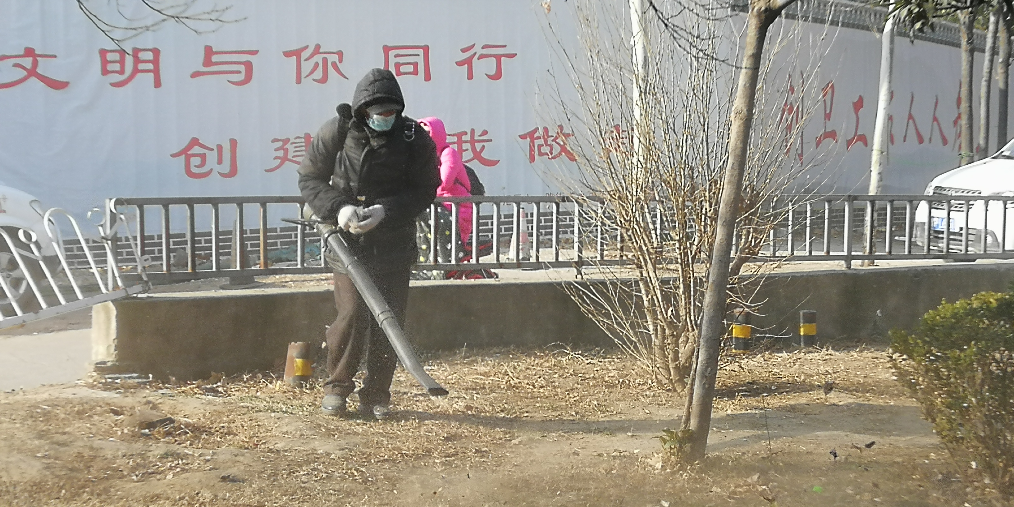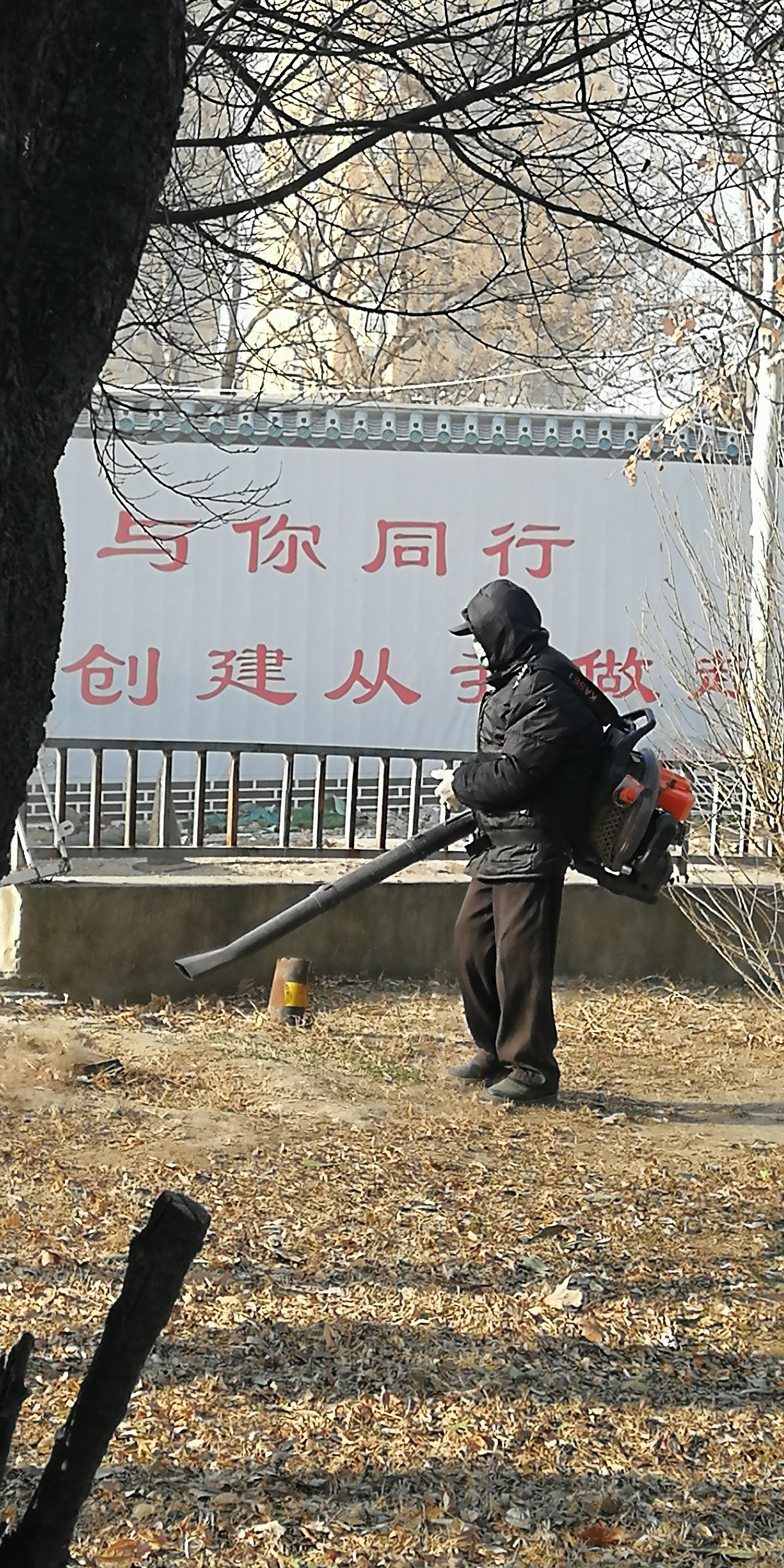 2月11日,大年三十。在川匯區(qū)濱河路上,工作人員背著吹風(fēng)機清理游園內(nèi)的落葉和垃圾。工作人員介紹,這樣便于更快更好地工作。(周口日報·周道客戶端記者 馬月紅)②7
