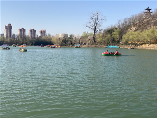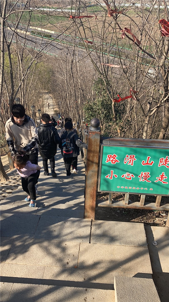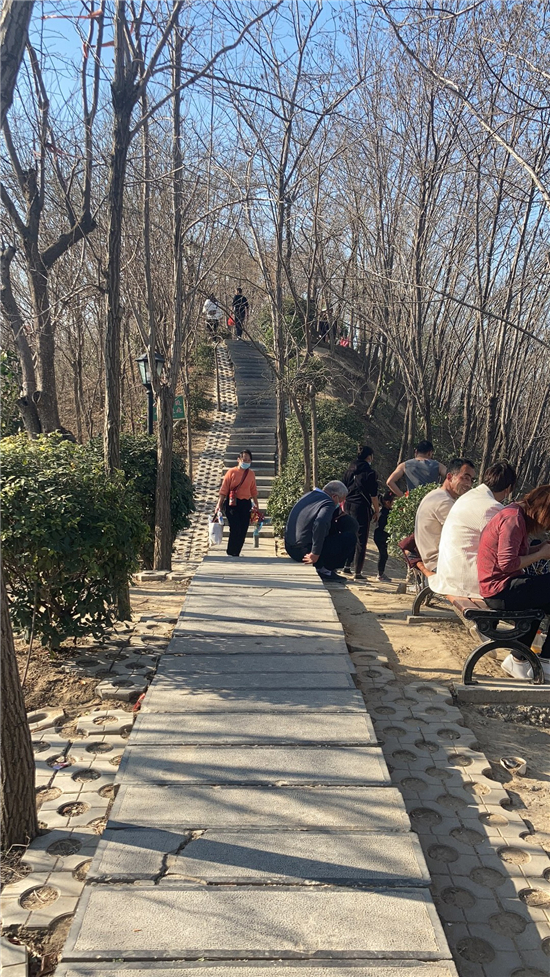 在槐香湖邊,年輕人三五結(jié)伴登上游艇,“坐船能到湖那邊的小島,島上也有槐樹,拍照肯定特別漂亮?!狈掂l(xiāng)大學生把七星島上的景色留在了自己的相機里。七星島與槐香湖相連的橋上,人潮擁擠,有的人席地而坐,觀賞著橋上的風景。當問道在外市工作的王先生游玩感受時,他回答到:“年后上班沒時間鍛煉身體,今天我把全家人帶來登山,呼吸一下新鮮空氣?!雹?