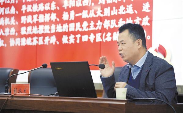 2月26日下午,商水縣舉行學(xué)黨史國(guó)史紅色教育大講堂活動(dòng)。商水籍北大學(xué)子劉水龍結(jié)合史料,精彩講述賀龍北伐在商水播下革命火種、彭雪楓經(jīng)周口東進(jìn)豫皖蘇燃起商水革命烈火、豫皖蘇軍區(qū)解放周口商水浴火重生,以及火熱革命中涌現(xiàn)出來(lái)的商水英烈艾力、趙海靜,支前模范徐乃貞等人的英勇事跡。這些生動(dòng)鮮活的歷史人物故事,再現(xiàn)了英雄兒女在商水大地上勇于革命、不怕?tīng)奚募t色革命歷史。劉水龍用豐富的史實(shí)、鮮明的觀點(diǎn)、精辟的講述,贏得臺(tái)下聽(tīng)眾陣陣掌聲。記者 付永奇 攝