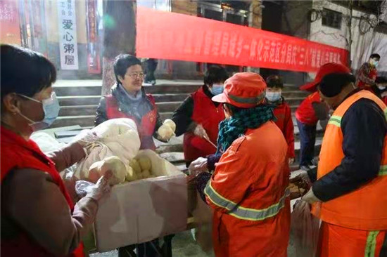 當日早上5時,在愛心粥屋里,示范區(qū)分局的志愿者們穿著紅馬甲,戴上口罩,立即進入忙碌狀態(tài),大家既分工明確又相互配合,現(xiàn)場井然有序。他們?yōu)榄h(huán)衛(wèi)工人盛飯端菜,拿雞蛋饅頭,動作迅速,熱情周到,有條不紊,個個忙得不亦樂乎。在這個清冷的早晨,因為有了熱氣騰騰的飯菜和志愿者忙碌的身影,環(huán)衛(wèi)工人開心地笑容,感受到濃濃暖意。