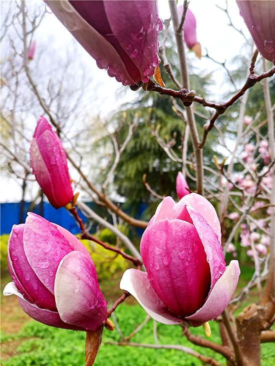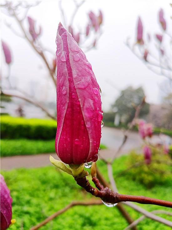 “霓裳片片晚妝新,束素亭亭玉殿春。已向丹霞生淺暈,故將清露作芳塵?!?月11日,我市下了一場小雨,路旁的紫玉蘭更顯晶瑩玉潤,朵朵玉蘭花如雨后新荷般清麗脫俗,或含苞待放、欲語還休,或花瓣盡展、舞姿翩翩,令人不禁駐足欣賞。