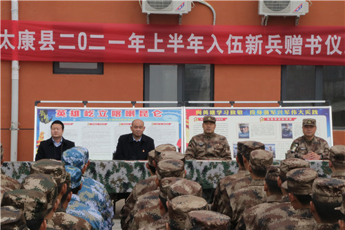 為打牢新兵聽黨指揮、獻(xiàn)身強(qiáng)軍事業(yè)的思想政治根基,3月19日上午,太康縣2021年上半年入伍新兵贈(zèng)書儀式在縣民兵訓(xùn)練基地舉行。太康縣委常委、人武部部長(zhǎng)于永前,縣黨史辦主任黃光遠(yuǎn)、縣退役軍人事務(wù)局黨組書記、局長(zhǎng)潘布道及即將入伍的190名新兵等參加儀式。會(huì)議由縣人武部副部長(zhǎng)張大釗主持。
