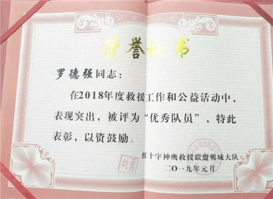 鄲城神鷹救援隊王梅說:“羅德強雖然加入時間不長,但是每次接到通知就立即趕到,任勞任怨、無怨無悔,是我們隊里公認的好同志?!绷_德強是一名普普通通的職工,還是一名胸懷大愛的熱心市民。每個人的生命都只有一次,因為見多了生死邊緣,他更希望人們珍愛自己的生命,他是一個戰(zhàn)士,他的勇氣讓所有人敬佩,因為有這樣的人,國人的風骨得以傳承挺立。
