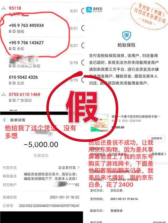 在3個多小時的通話里,輕信了騙子的小輝,接連被對方以需要“退回理賠款”和提供“資金流水證明”為借口,騙取了5000元錢的“樂花卡”網(wǎng)貸、2300元的花唄和999元的個人賬戶資金。由于是共享屏幕,個人信息泄露無遺,騙子還登錄了小輝的京東賬號,冒充小輝與客服人員聊天,套取了京東白條2400元錢,用于購買游戲網(wǎng)卡。