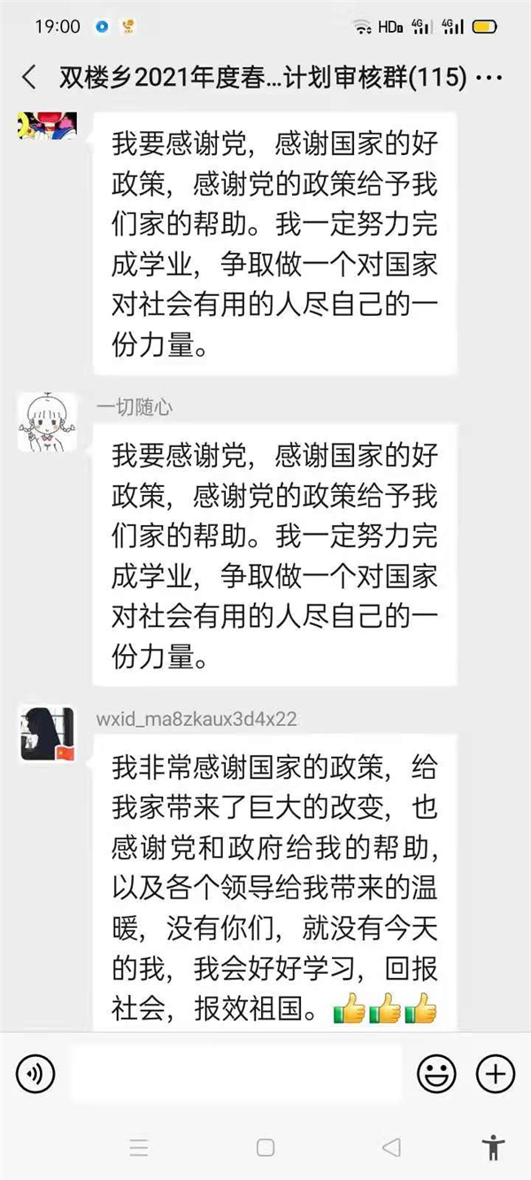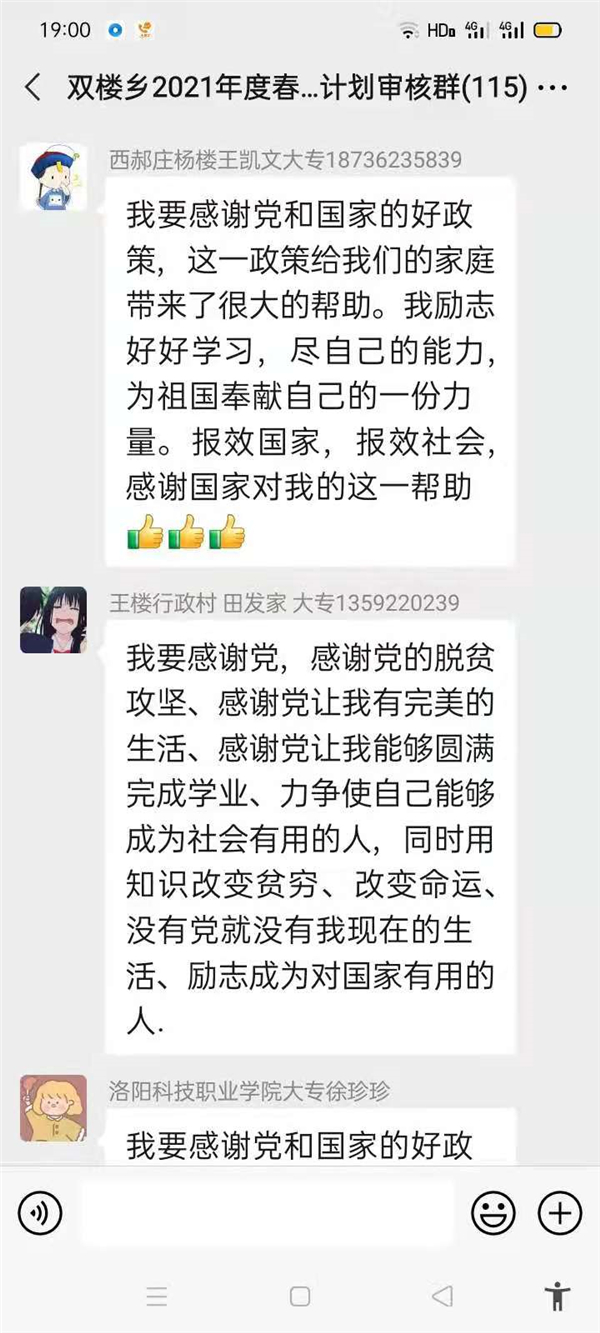 “感謝幫助過(guò)我家的所有幫扶人,沒(méi)有你們,就沒(méi)有我家今天的幸福生活,我們光榮脫貧了,作為貧困家庭中新成長(zhǎng)勞動(dòng)力,我一定珍惜這次來(lái)之不易的學(xué)習(xí)機(jī)會(huì),好好學(xué)習(xí)技術(shù),畢業(yè)后回村成為一名技術(shù)帶頭人,來(lái)促進(jìn)家鄉(xiāng)產(chǎn)業(yè)的發(fā)展?!编惓强h雙樓鄉(xiāng)孫莊村脫貧學(xué)生張素華在微信群里說(shuō)。近幾天,鄲城縣雙樓鄉(xiāng)114人的大學(xué)生微信群里可熱鬧了,在鄉(xiāng)黨委政府的引導(dǎo)下,該鄉(xiāng)眾多脫貧后的大學(xué)生通過(guò)鄉(xiāng)里建起的微信群,紛紛圍繞“話脫貧、感黨恩、奮進(jìn)新時(shí)代”這一主題交流思想,提振斗志。