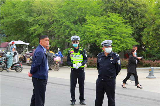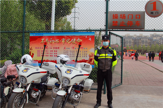 活動(dòng)計(jì)劃是上午9時(shí)開始,朱衛(wèi)兵帶領(lǐng)鐵騎隊(duì)從早上7點(diǎn)就來到校園周邊布置崗哨,對(duì)鄲城一高周邊的校園路、公園東路、一高北路、一高東路、公園北路進(jìn)行車輛引導(dǎo),共出動(dòng)警力46人,警車一部,警用摩托車21輛,形成了各路口有崗、50米一哨。一方面確保車輛有序停放,另一方面守護(hù)師生和家長(zhǎng)安全。
