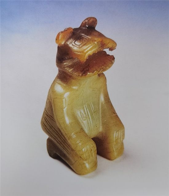 此器將虎首、人身完美地集于一體,匠心獨運,巧奪天工,通身飾陰線云紋,僅個別部位如雙臂紋飾用單線陰刻,生動傳神。虎首跽坐人佩是長子口墓中為數(shù)不多的圓雕作品。它不僅充分反映了西周早期絢麗奪目的玉雕藝術(shù),而且還為了解周人的坐姿、服飾、冠式、發(fā)式提供了寶貴的第一手材料,具有很高的歷史價值和藝術(shù)價值。