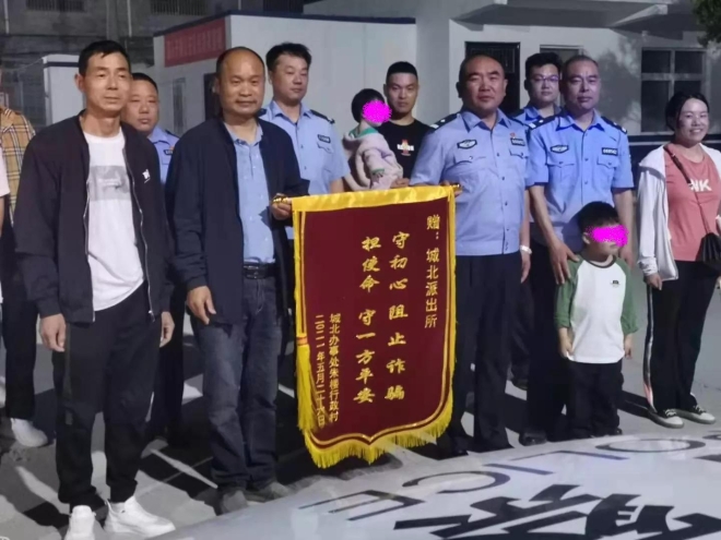 5月26日,城北辦事處朱樓村6名村民一起前往城北派出所,送上一面繡有“守初心阻止詐騙 擔(dān)使命守一方平安”鮮紅錦旗。