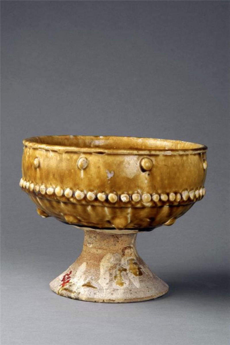 壽州窯主要生產(chǎn)與生活相關(guān)的碗、盞、杯、缽、注子等,其生產(chǎn)的高檔產(chǎn)品深受當(dāng)時富貴之家追捧。唐代是中國歷史上的盛世,社會經(jīng)濟(jì)繁榮,黃釉瓷與體現(xiàn)皇權(quán)的皇家貴族崇尚的富貴色彩不謀而合,所以黃釉瓷器很快受到社會的熱捧,黃釉瓷豆也流行開來,且造型富于變化,這件黃釉乳釘紋豆口、腹、底部都有不同的變化,給人以線條流暢、造型優(yōu)美的印象。