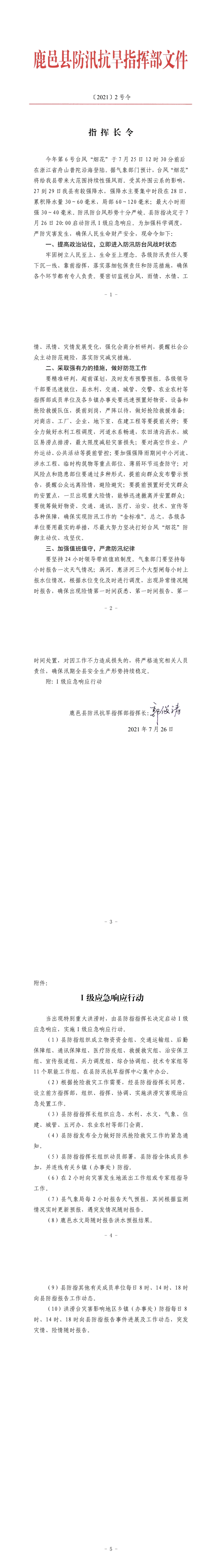 鹿邑縣防汛抗旱指揮部于7月26日晚8點(diǎn)啟動(dòng)防汛Ⅰ級應(yīng)急響應(yīng),并發(fā)布《指揮長令》2號,從防汛Ⅳ級應(yīng)急響應(yīng)提升到防汛Ⅰ級應(yīng)急響應(yīng),動(dòng)員全縣上下積極行動(dòng),做好防范,應(yīng)對臺風(fēng)“煙花”帶來大范圍持續(xù)性強(qiáng)風(fēng)雨。
