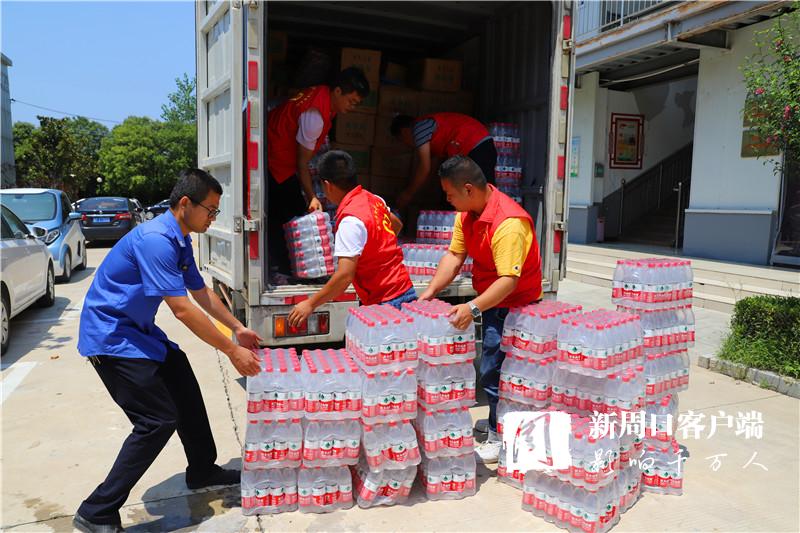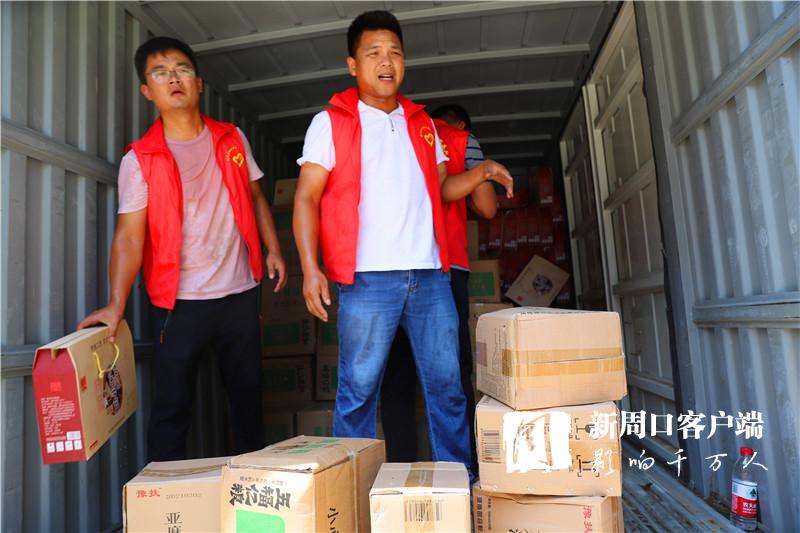當(dāng)天中午,掛著印有“昨天大家助我脫貧,今天我為救災(zāi)出力!”條幅的防汛救災(zāi)物資運輸車抵達周口港區(qū)。“要不是前兩天防御臺風(fēng)‘煙花’,我們早就來了?!甭」糯妩h支部書記段長春一下車就連忙慰問眾人。一同前往的還有6位年輕力壯的志愿者,他們不辭勞苦,和港區(qū)消防、城管人員一起頂著烈日,用了半個多小時將滿車物資搬運到位。