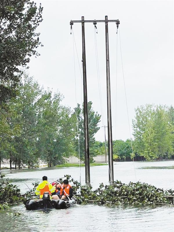 國網(wǎng)周口供電公司職工駕駛沖鋒舟在水中搶修線路。童之潔 攝