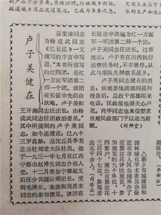 《河南日報(bào)》刊發(fā)《盧子美健在》的消息
