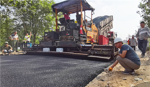 路面鋪油作業(yè)從淮陽區(qū)葛店鄉(xiāng)與鄲城縣李樓鄉(xiāng)交界處開始,一臺攤鋪機鋪設(shè)寬度為7米,壓實厚度為5厘米,以平均每分鐘5米的速度前行,數(shù)輛運料車輪流供料給攤鋪機。攤鋪機過后,兩臺壓路機交替運行,立即把路面壓實;兩臺灑水車配合作業(yè),路面一次成型,寬闊而平坦。