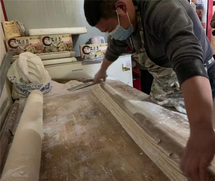 此時(shí),固墻鎮(zhèn)集市最低溫度為零攝氏度,40歲的王永強(qiáng)卻汗流浹背。他,正在自家面館里忙得熱火朝天。從14歲起,王永強(qiáng)就跟著表哥學(xué)習(xí)做手搟面,到現(xiàn)在已有26年的制作經(jīng)驗(yàn)?!斑^(guò)年這段時(shí)間一天搟10小時(shí)以上,能出個(gè)七八百碗,就這都賣(mài)不及?!蓖跤缽?qiáng)邊說(shuō)邊做準(zhǔn)備工作,只見(jiàn)他將一盆醒好的、重40斤,用高筋面粉和鹽和好的面團(tuán)鋪在案板上,拿出一根一米五長(zhǎng)的鐵棍將面團(tuán)按壓平整,再用有十幾年歷史的搟面杖,邊鋪撒玉米淀粉、邊用力搟。1個(gè)小時(shí)后,面團(tuán)被搟至薄皮狀,最后按層折疊鋪好,用快刀切成相等寬度,撣走多余面粉,挽成麻花狀。如此,遇水不散、出水不沾、溫潤(rùn)光滑、筋而不膩的固墻手搟面就完成了。固墻手搟面最常見(jiàn)的做法是用大火多水煮沸后,撈起配以番茄雞蛋、蒜泥黃瓜,拌勻后享用。夾起一筷子面條,觀其形如玉帶臨風(fēng),察其色若飛雪粼粼,送入口中品其味,則似玉蘭入口,真是美哉!爽哉!